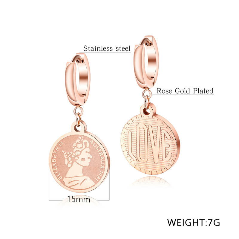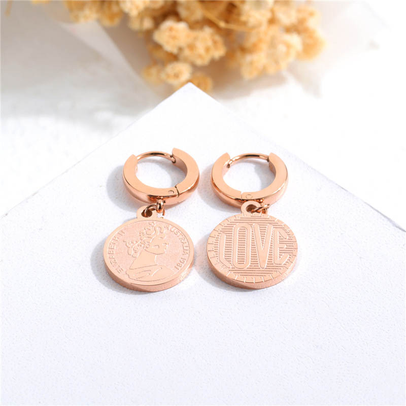 甲丸タイプの細身のピンクゴールドカラーのリングピアスに女神と英語のLOVEとデザインしたコインのようなチャームが揺れるピアスを1ペアにした人気のステンレスピアス。