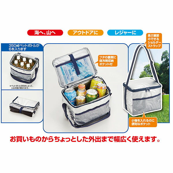 持ち運び便利なショルダー式のソフトクーラーバック 350mlのペットボトルが立てて6本入ります 前面には小物収納に便利なポケット付 蓋裏には保冷材収納ポケット付 未使用時はコンパクトに折りたたみできます ○材 質:●本体/ポリエステル・アルミ蒸着シート ●断熱材/ポリエチレンフォーム ●中敷き/ポリエチレン ○サイズ:約230×170×180mm ○重 量:約210g ○仕 様:●収納時/約240×190×80mm ●全面ポケット・フタ裏保冷剤入れ収納ポケット ●350mlのペットボトルが立てて6本入ります ○生産国:中国